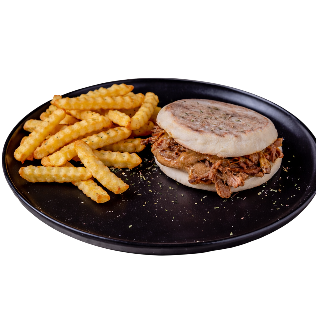 Carne de Novilho Desfiada e Bolo do Caco. Acompanha com Batata Frita Crinkle e e Molho Churrasco.